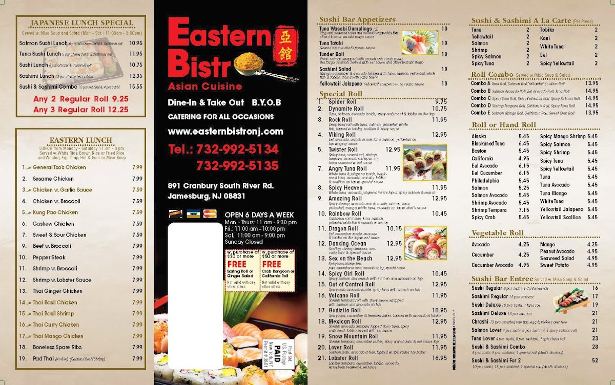 Located in Jamesburg, NJ, Eastern Bistro serves an enticing array of Asian cuisine that delights the senses. Their menu features fresh ingredients and vibrant flavors, showcasing dishes like the savory Chicken with Broccoli and Lo Mein options, where you can choose between hearty pork or vibrant vegetables.